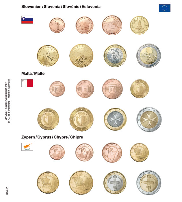 Pildileht mündilehega euromüntide aastakäikudele (Sloveenia, Malta, Küpros).