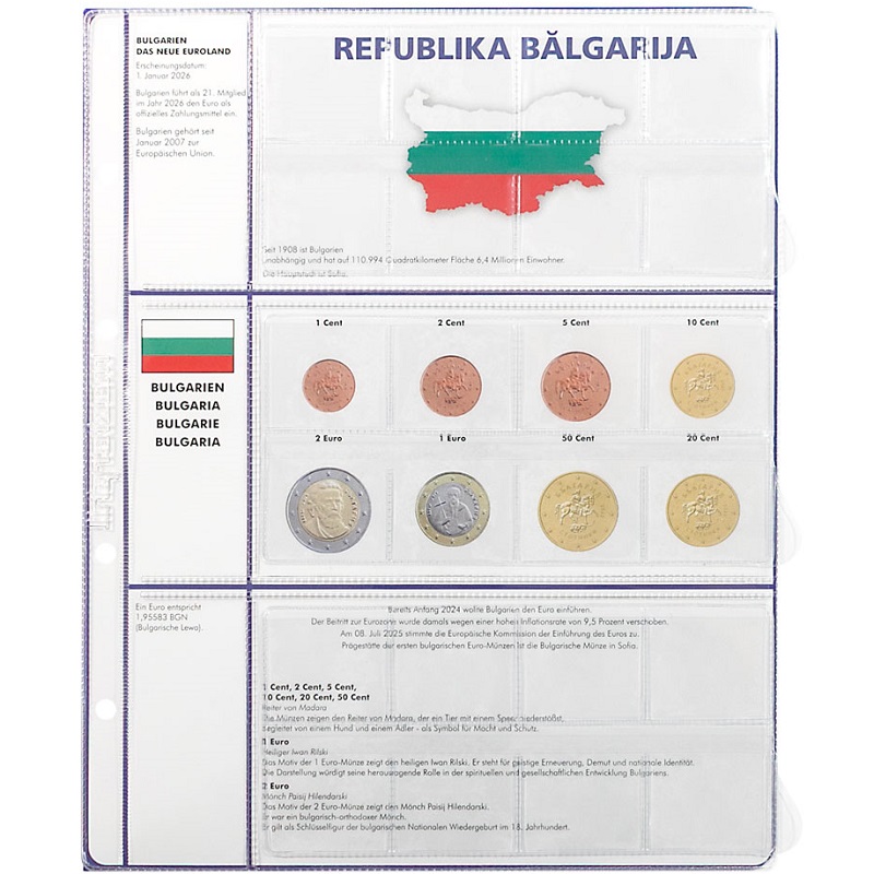 Illustreeritud album on mõeldud kõigi eurotsooni riikide käibemündiseeriate hoidmiseks. Iga leht mahutab kolm seeriat käibemünte erinevatest riikidest.