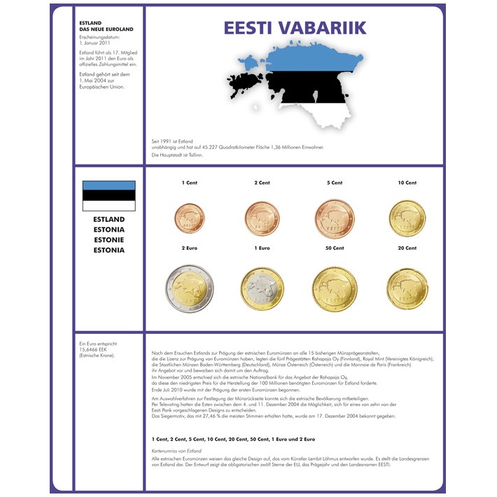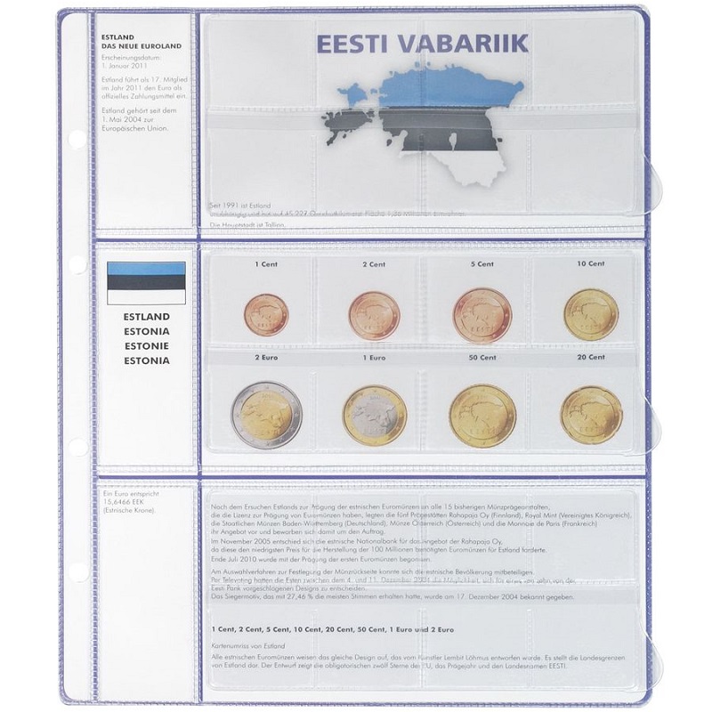 Pildileht mündilehega euromüntide aastakäigule (Eesti).4-rõngasmehhanism (45/65/45 mm).Formaat: 20 х 25 cm.Sobib EURO COLLECTION albumile.Tootja: Lindner (Saksamaa).