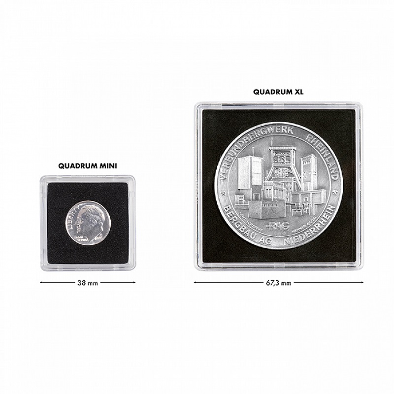 Kandilised mündikapslid Quadrum Mini 12,0 mm (siseläbimõõt).Välismõõt: 38 x 38 x 6,4 mm.Sisekõrgus: 3,3 mm.Pakis on 10 tk.Tootja: Leuchtturm (Saksamaa).