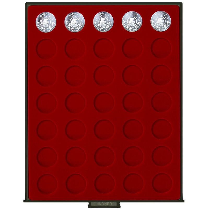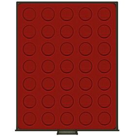 Standard - helepunane sametist alus, helehalli värvi käepidemega, pleksiklaasist raamis.