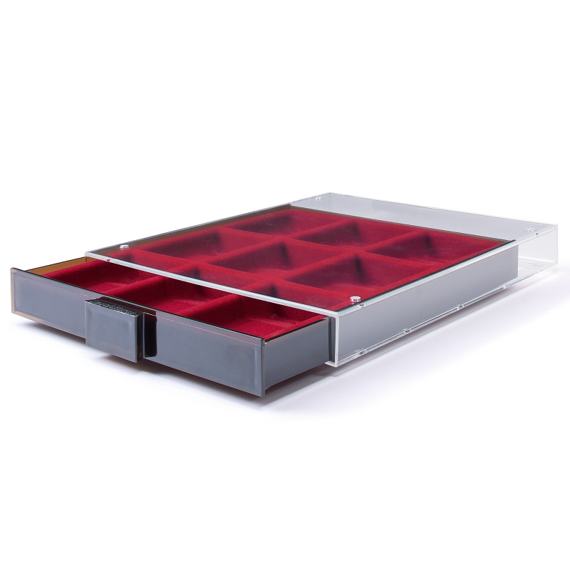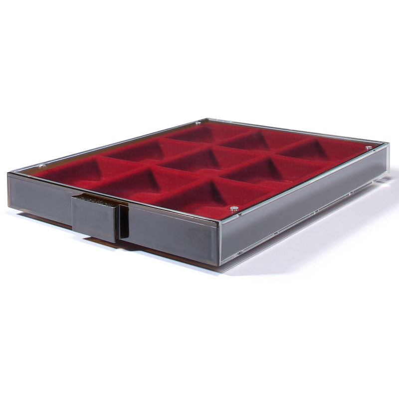 Tumepunane sametist alus, tumeda läbipaistva käepidemega, suitsuklaasist raamis.