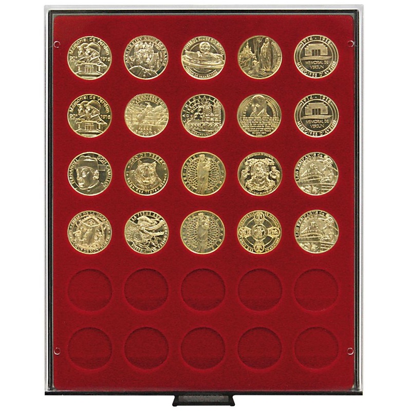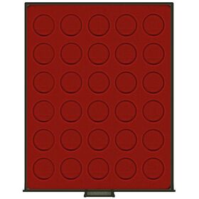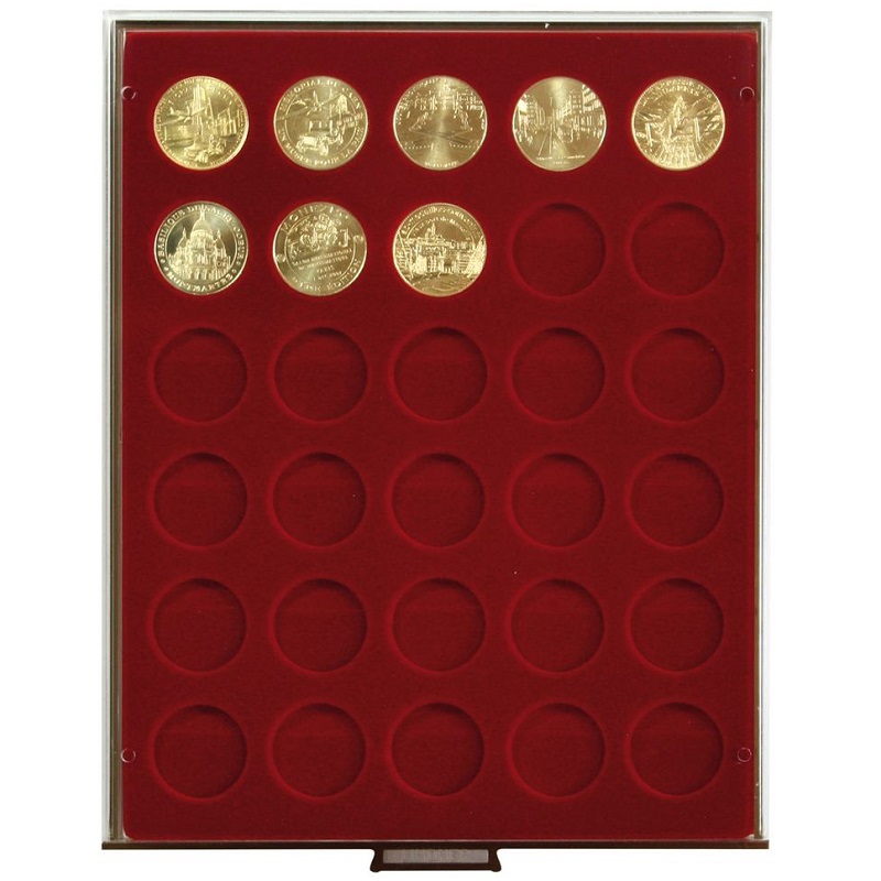 Standard - helepunane sametist alus, helehalli värvi käepidemega, pleksiklaasist raamis.